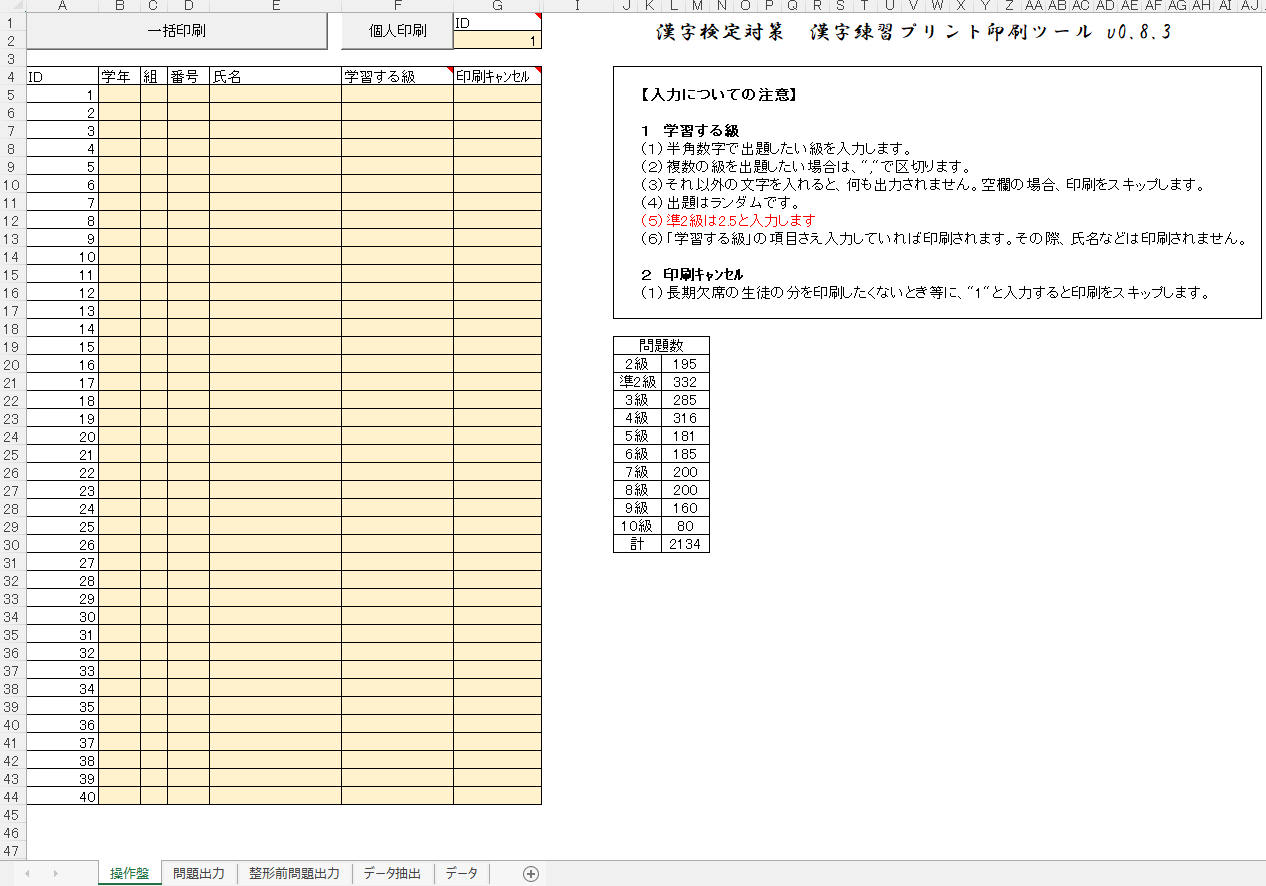 何より気が利いてるのが、級が混ざってても一発で刷れるところ。 2級を受ける子と5級を受ける子が同じ教室にいるなんて、現場じゃ当たり前でしょ? それを一人ずつ設定して刷るなんて、苦行よ。 それがこれなら『はい、番号順に配ってー』で終わり。 この『手離れの良さ』。制作者は、よっぽど忙しい先生の背中を見てきたか、あるいは自分もその地獄を見てきた人ね。